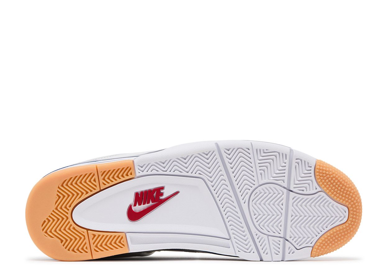 The Nike SB x Air Jordan 4 Retro SP 'Navy' sports a white leather upper with a grey suede forefoot overlay and side panel netting. A red Jumpman embellishes the tongue, while an embossed Nike SB logo adorns the navy heel tab. More navy accents decorate the eyelets and foam midsole, which showcases a visible Nike Air unit in the heel. A herringbone-patterned outsole uses gum rubber in high-wear areas for enhanced durability.