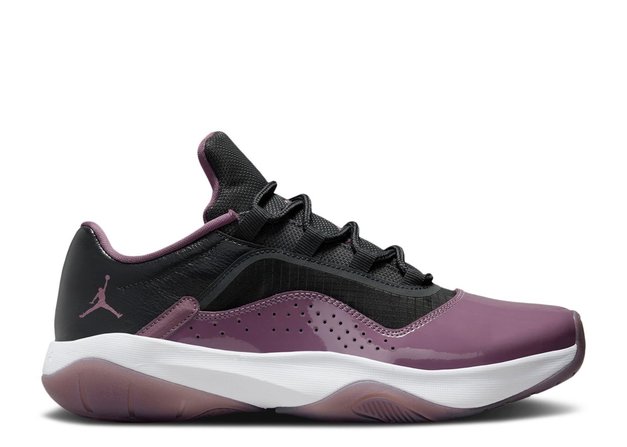 Inspired by past Air Jordan models, the Women's Air Jordan 11 CMFT Low 'Sky J Mauve' uses rope-style laces that feed through webbed eyelets to secure the black leather upper. A shiny, grape-colored patent leather overlay provides some color contrast. A white foam midsole keeps things soft underfoot, anchored by a purple see-through rubber outsole.